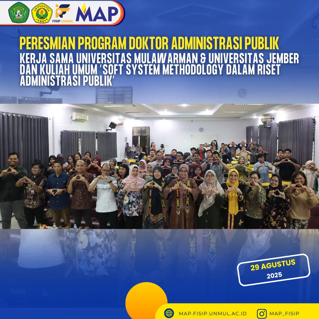 Fakultas Ilmu Sosial dan Ilmu Politik (FISIP) Universitas Mulawarman secara resmi meluncurkan Program Doktor Administrasi Publik hasil kerja sama dengan Universitas Jember. Kegiatan peresmian ini juga dirangkaikan dengan Kuliah Umum bertajuk “Soft System Methodology dalam Riset Administrasi Publik”, yang dilaksanakan di Ruang Serbaguna Fisip Unmul dan dihadiri oleh civitas akademika, mahasiswa pascasarjana, serta tamu undangan dari berbagai instansi.