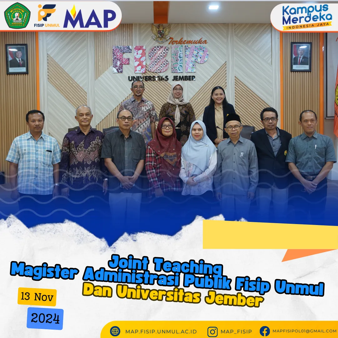 Magister Administrasi Publik FISIP Unmul Melakukan Joint Teaching antara Magister Administrasi Publik FISIP Unmul dan Universitas Jember (Unej) adalah salah satu langkah strategis untuk memperkaya pengalaman akademik dosen dan mahasiswa kedua universitas, serta memperluas wawasan dalam pengajaran, kurikulum, dan metodologi pengajaran di bidang administrasi publik. Program Joint Teaching ini melibatkan kolaborasi dalam pengajaran, baik dalam bentuk kuliah bersama, seminar, atau proyek kolaboratif yang melibatkan dosen dan mahasiswa dari kedua institusi