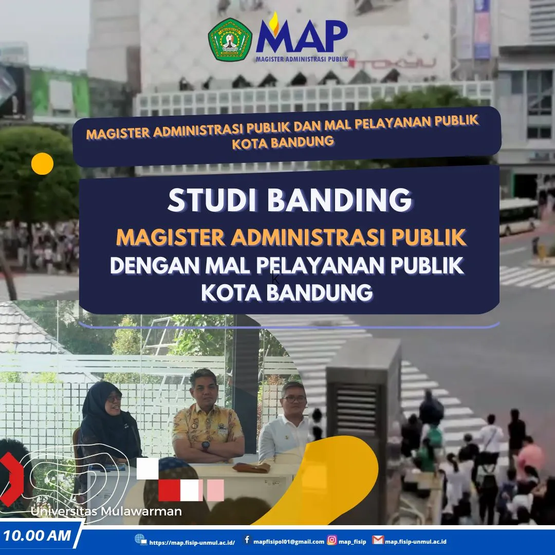 Program Magister Administrasi Publik (MAP) Fakultas Ilmu Sosial dan Ilmu Politik Universitas Mulawarman melaksanakan kegiatan studi banding ke Mal Pelayanan Publik (MPP) Kota Bandung pada tahun 2023. Kegiatan ini bertujuan untuk memperluas wawasan akademik sekaligus memperdalam pemahaman mahasiswa dan dosen mengenai praktik pelayanan publik yang inovatif di tingkat daerah.